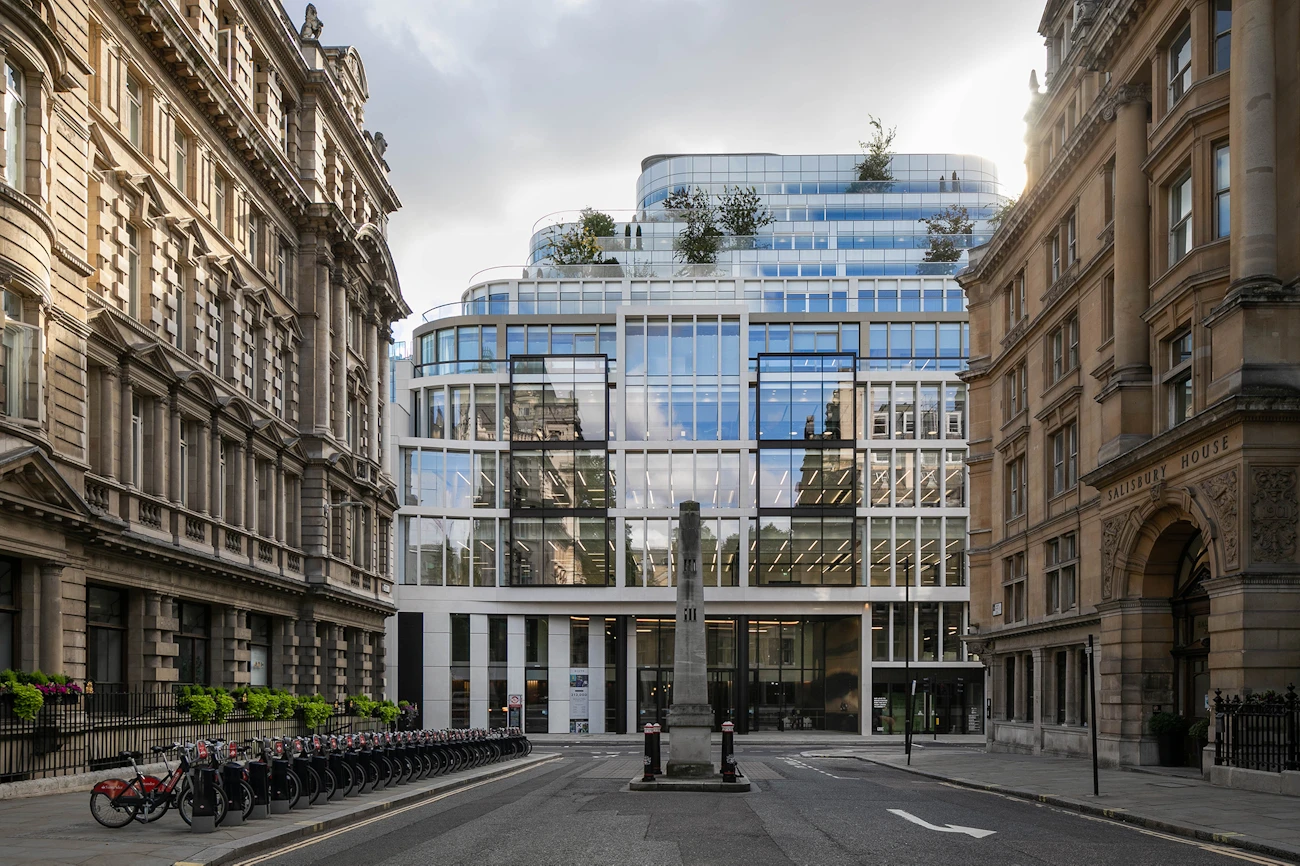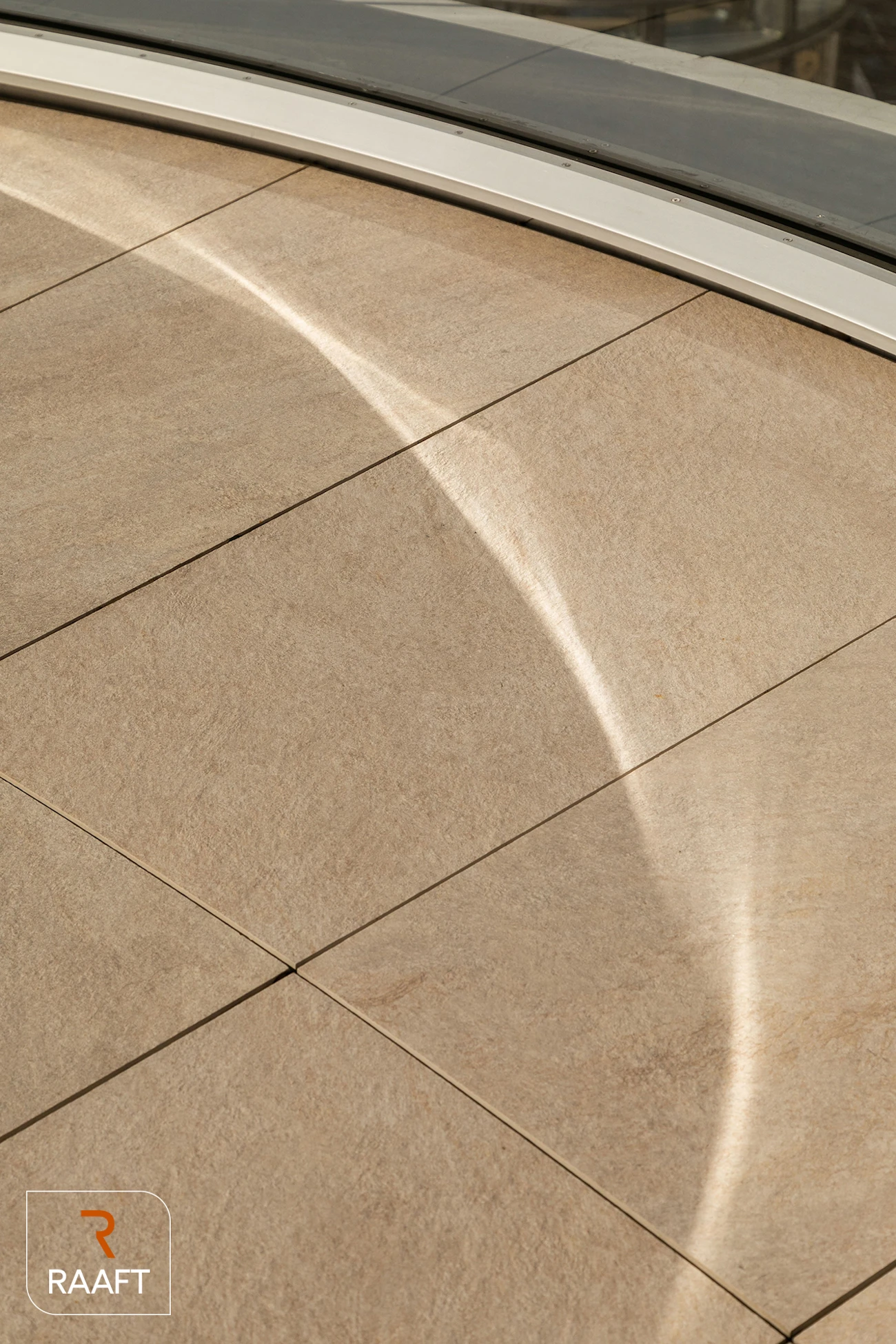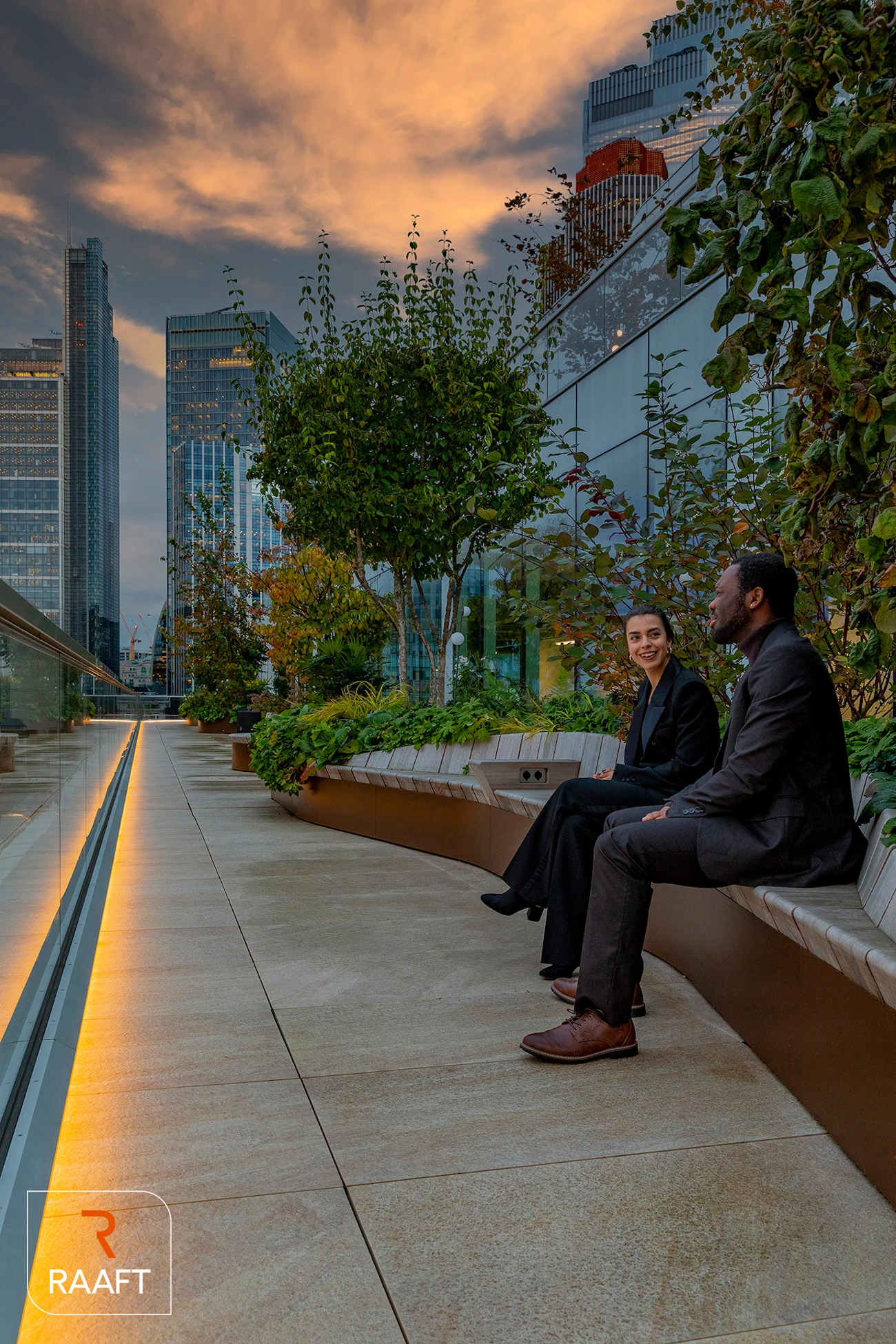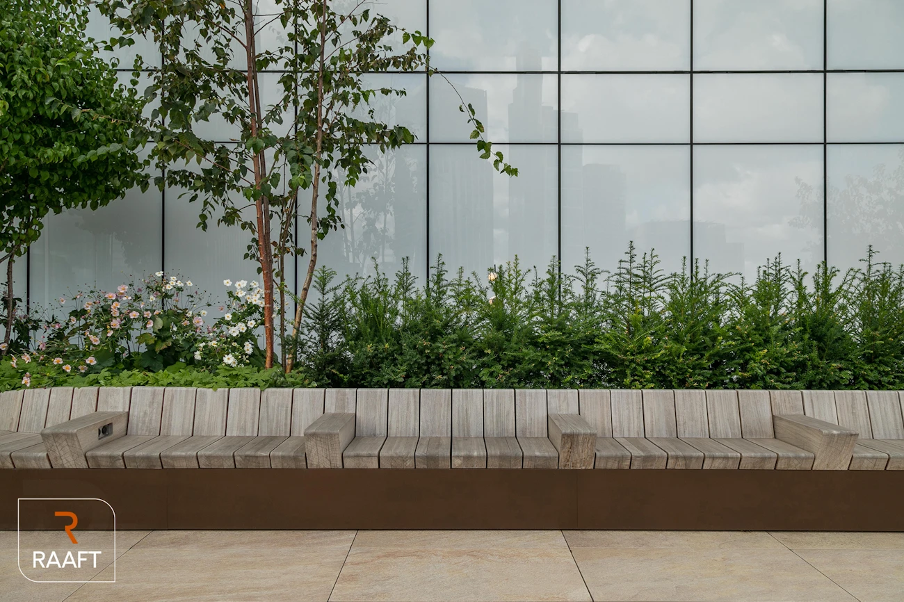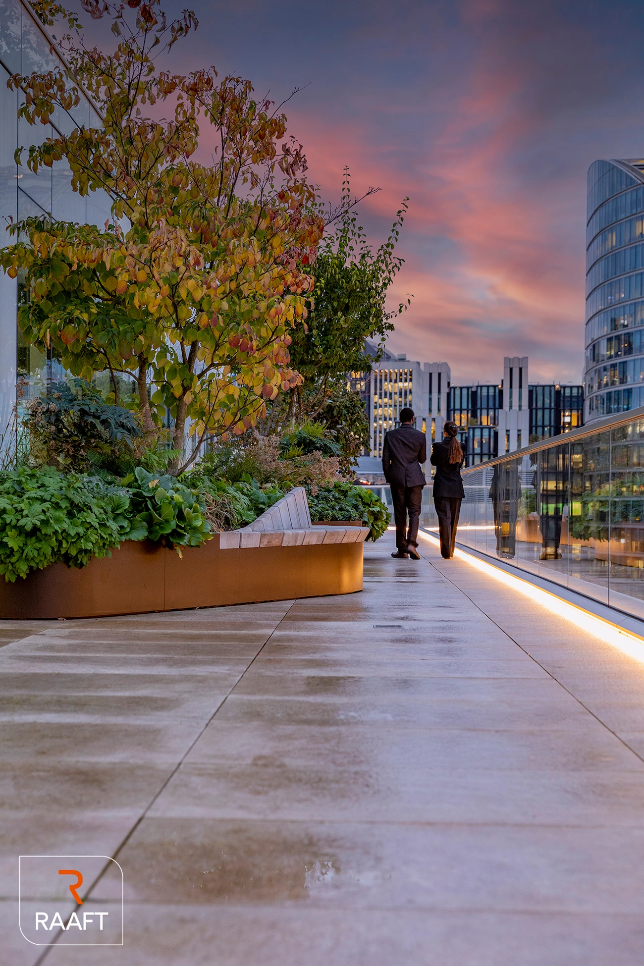 Ideally situated within the square mile of the City at EC2, 60 London Wall comprises of office accommodation set over ten floors, with five outside terraces. The impressive development has breathtaking views, superb transport links and is just a stone’s throw from Moorgate. The Raaft Terrace System was completed in November 2020 and complements the scheme beautifully.The project vision was to be best in class for accommodation, accessibility, amenities, and aesthetics. With such high expectations, the terraces had to meet truly exceptional standards. The architects vision saw the outdoor space as busy, thriving communal areas for office staff, set among greenery and beautiful architecture. The brief included intricately cut tiles and curved planters to create a beautiful and very striking curvature around the building, and benches to allow employees to relax or entertain guests.Roof terraces that meet truly exceptional standardsUniquely shaped benches were professionally joined from ethically sourced hardwood. The snaking benches had graduating seat back height which meant each piece was individually cut to size. The benches transition seamlessly into the CorTen steel planters (powder-coated in RAL 8014) for a particularly modern design. Each planter is pre-formed and delivered to site for quick and simple installation.Atria Roma Natural Porcelain Tiles are R11 slip-resistant. As well as being incredibly high quality, hardwearing and fire-resistant, they can be delicately handled to produce cut curved edges.Adjustable Pedestals and Joists, as part of the Raaft Support Structure were perfect to support multiple surface finishes, and waterproofing and insulation requirements.