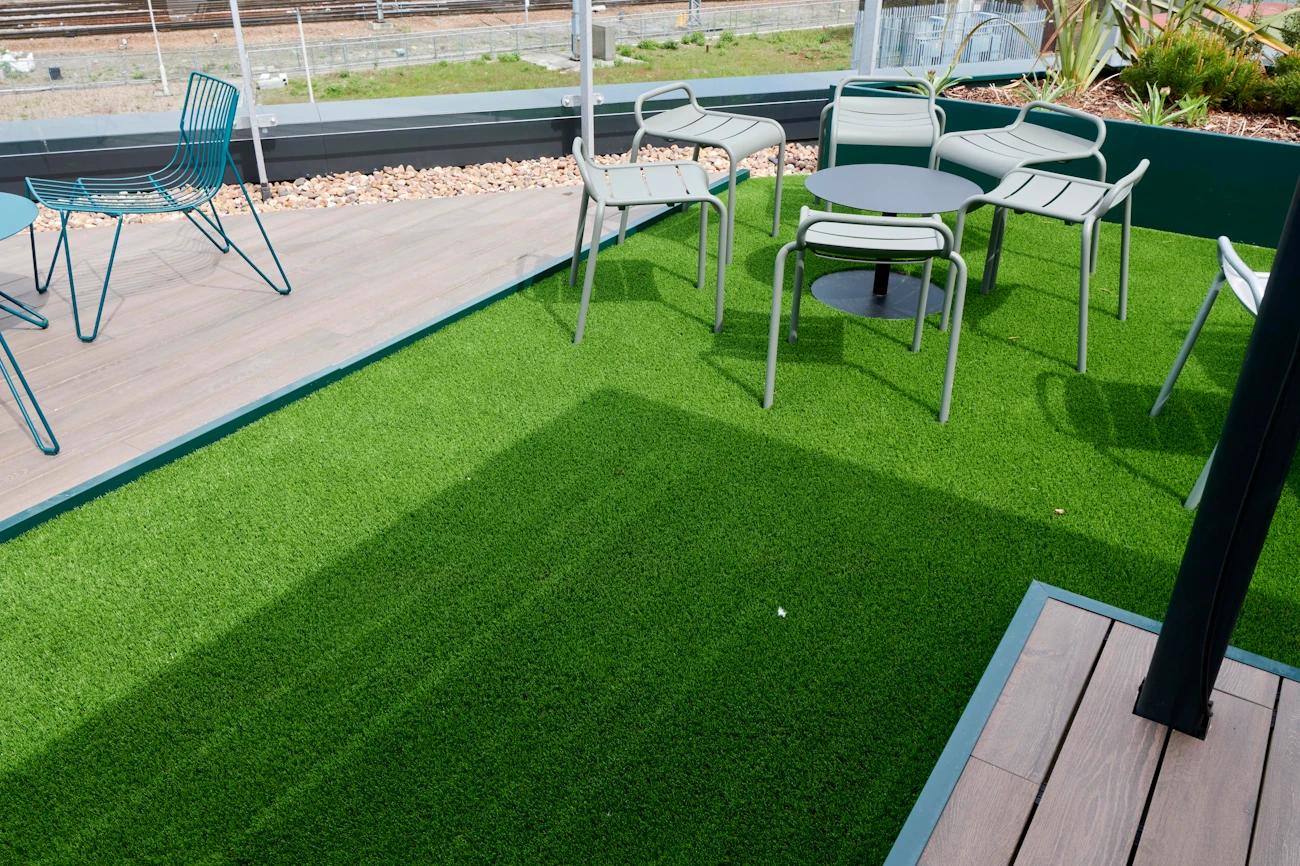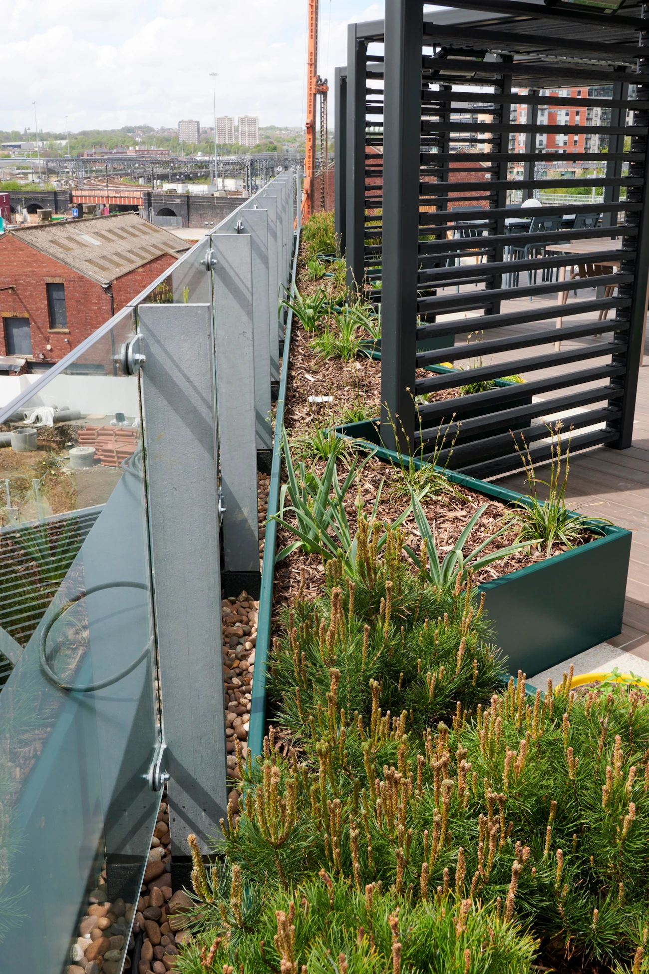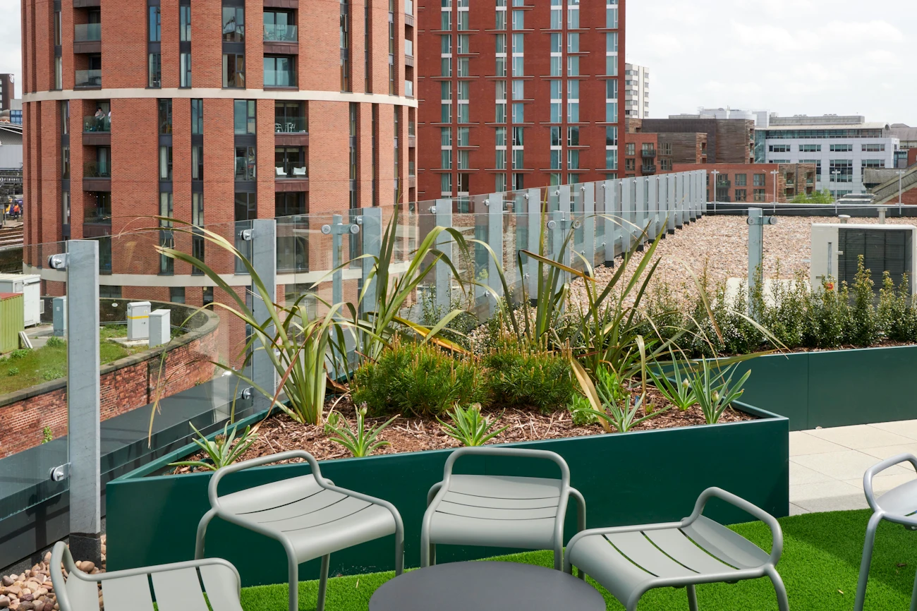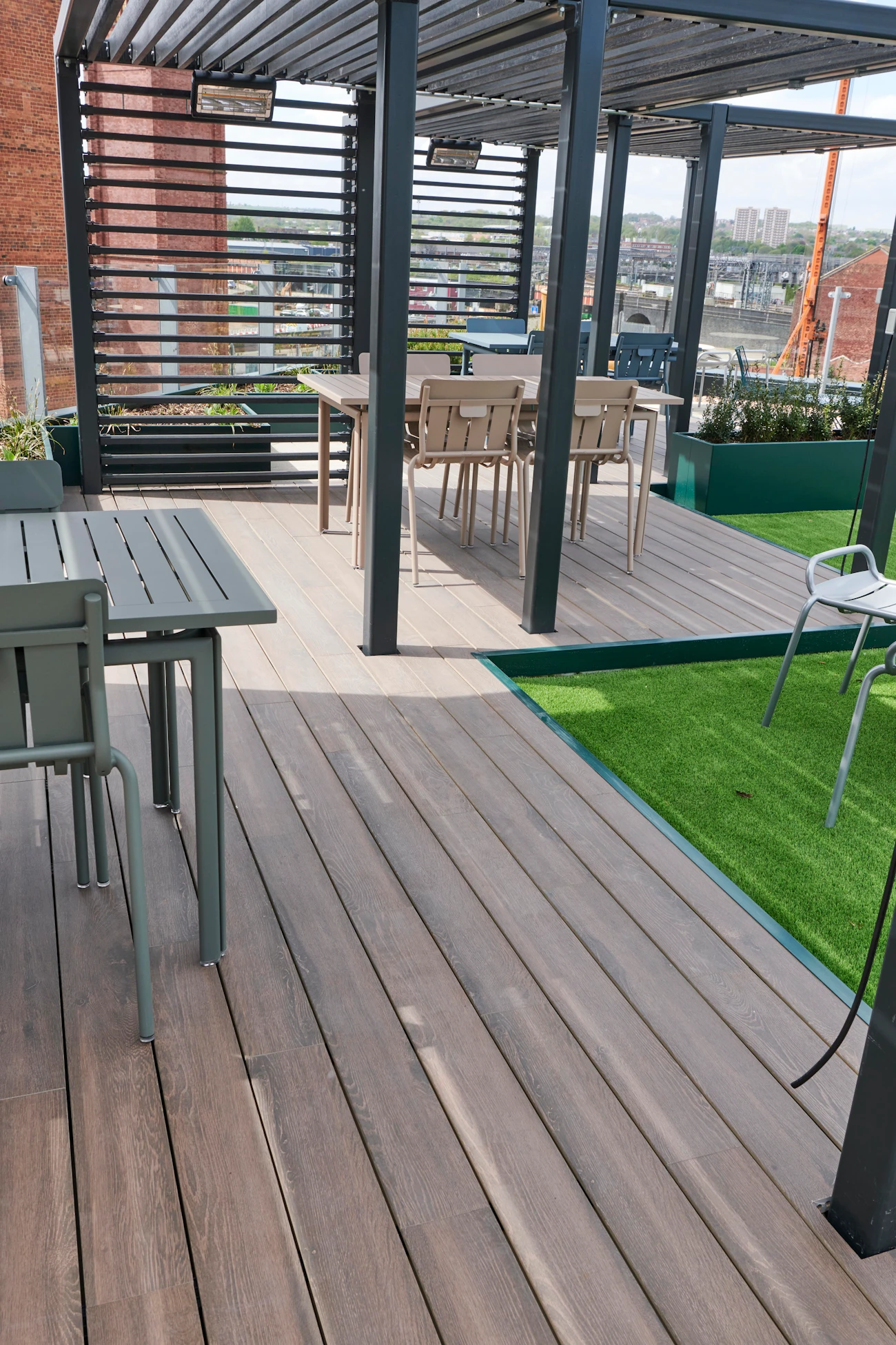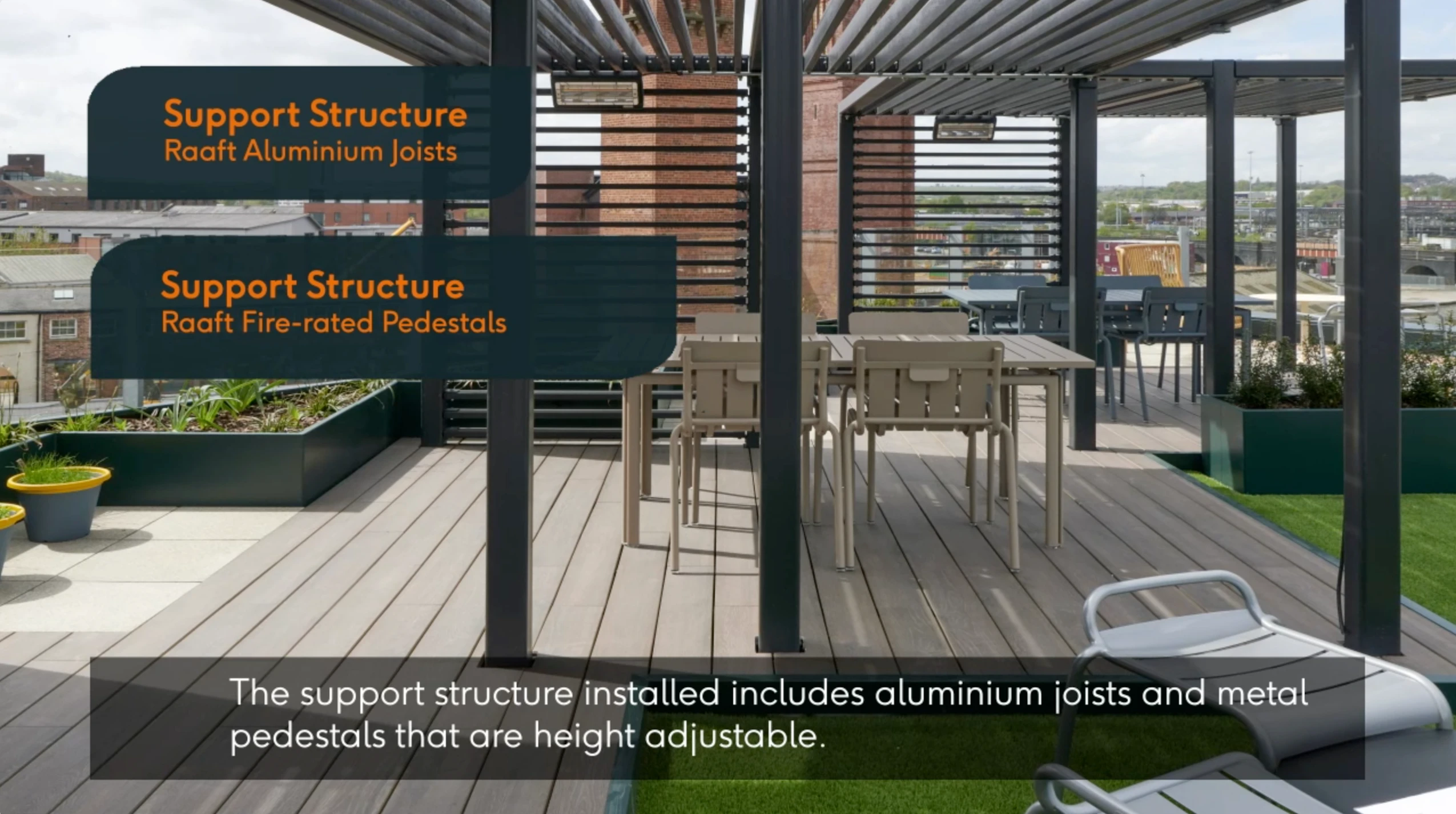 Mustard Wharf, located in the South Bank neighbourhood of Leeds, offers one-, two- and three-bedroom boutique apartments with roof gardens, a clubhouse, gym and private dining rooms for residents.Roof spaces at Levels 3 and 4 of the development’s Building A required terrace systems that are attractive, durable, functional and fire-safe.Fire-safe MaterialsThe client’s original preference for the decking surface was powder-coated aluminium, but as this product only has a Class A2 fire rating they opted for the striking dark-wood effect of Raaft’s Class A1-rated Farrino 'Cocoa' porcelain decking. Other considerations that influenced this decision were Farrino’s resistance to wind uplift and scratch-resistant, slip-resistant surface. The architects also specified Raaft’s fire-rated support structure, using Raaft aluminium joists and fire-rated metal pedestals to create a fully compliant terrace.