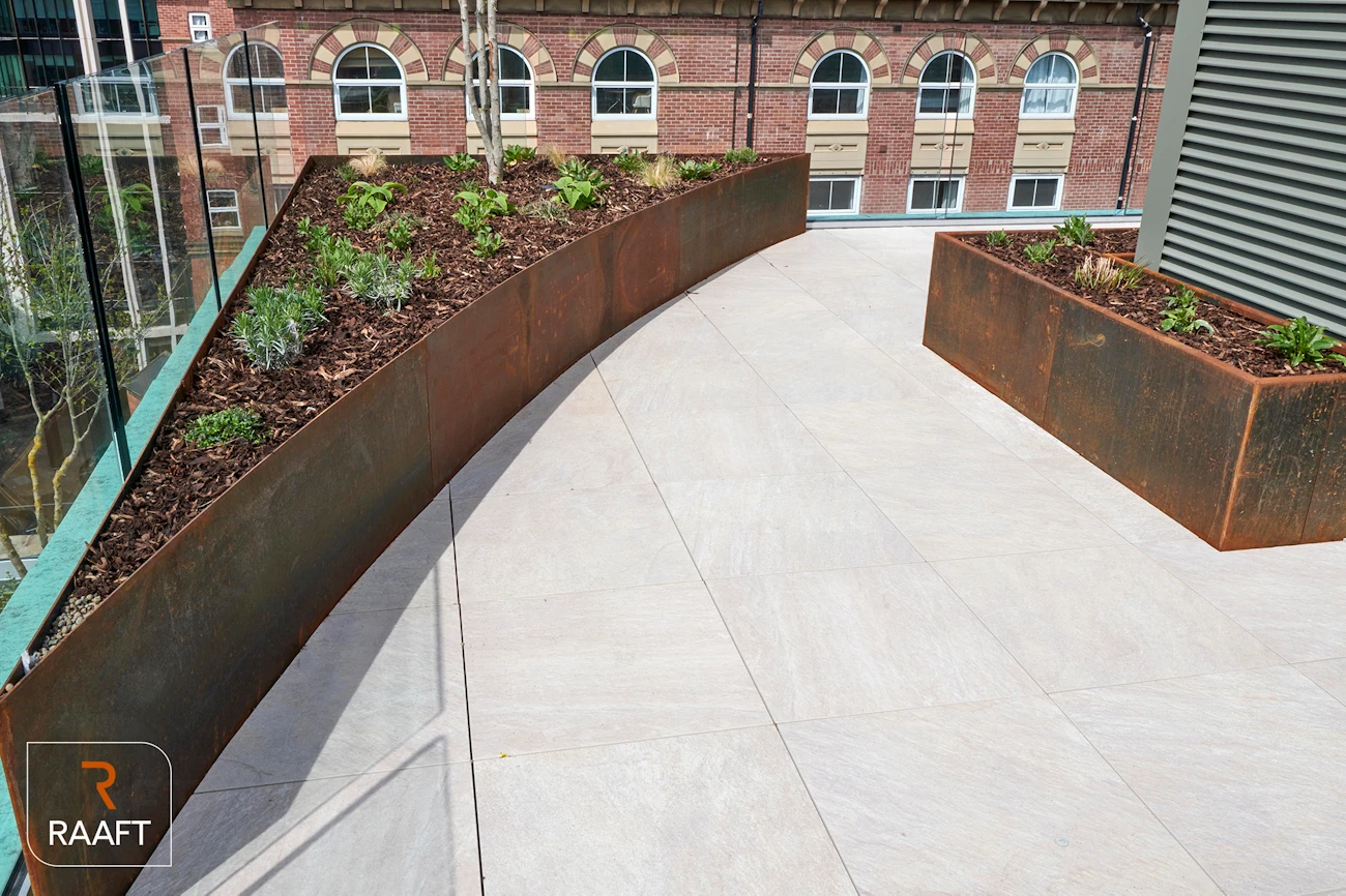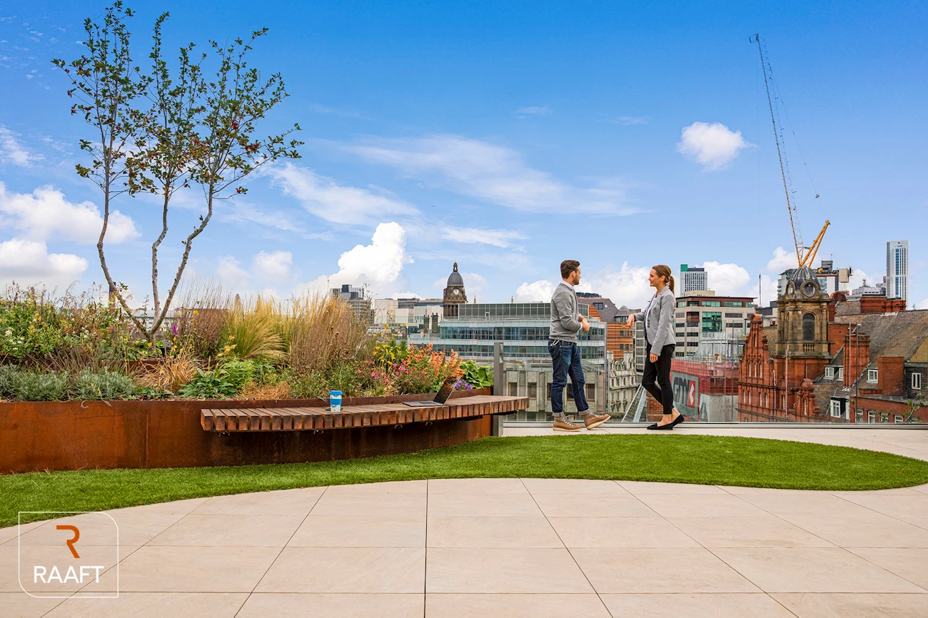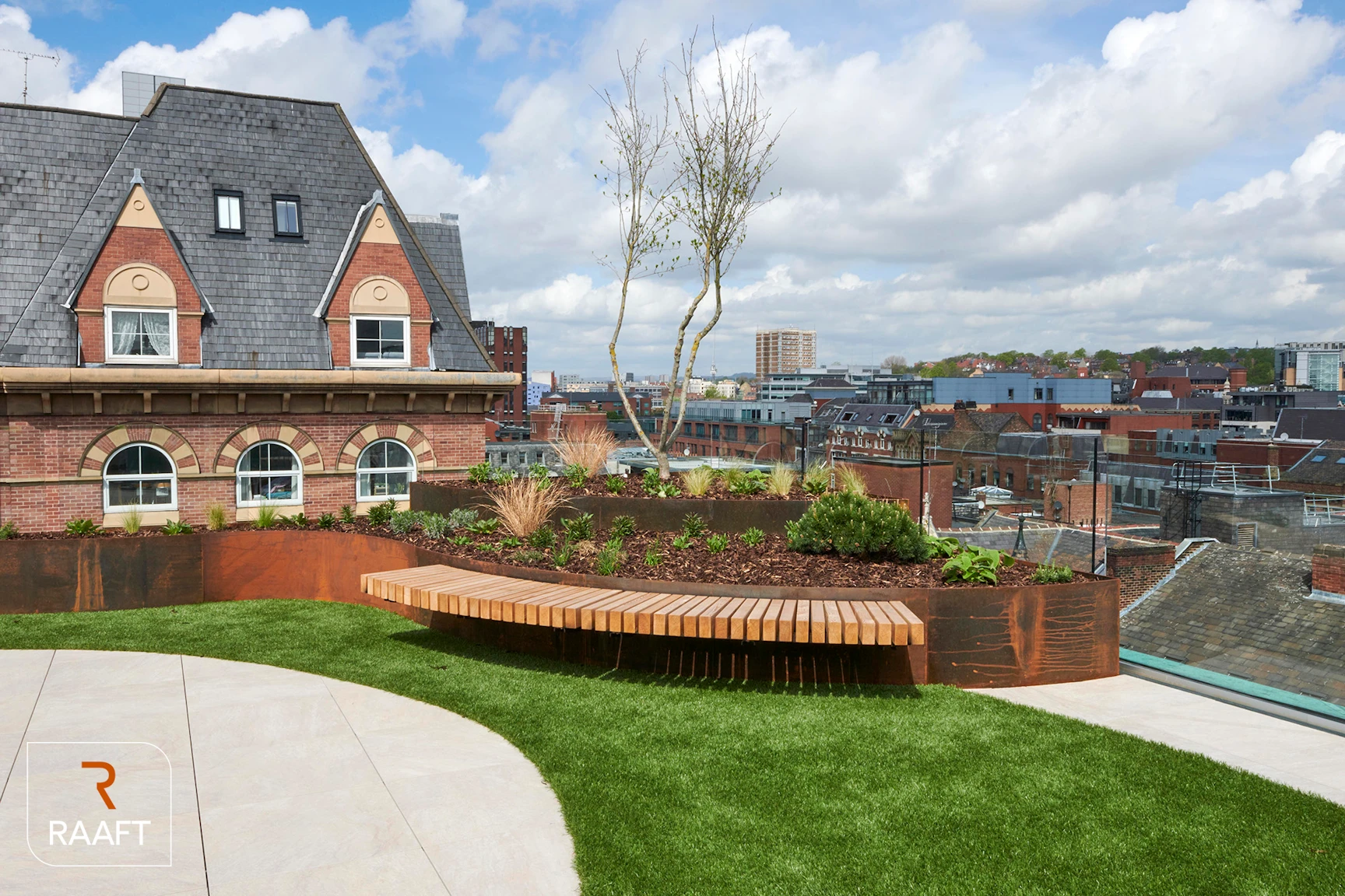 A key new feature is a roof garden for the sole use of the sixth-floor occupier, and landscape designer John Davies Landscape Architecture wanted this to be a garden in its truest sense. Terrace system products from Raaft gave choice and versatility to ensure this vision became reality, while ensuring the finished results satisfied the requirements for durability and safety.