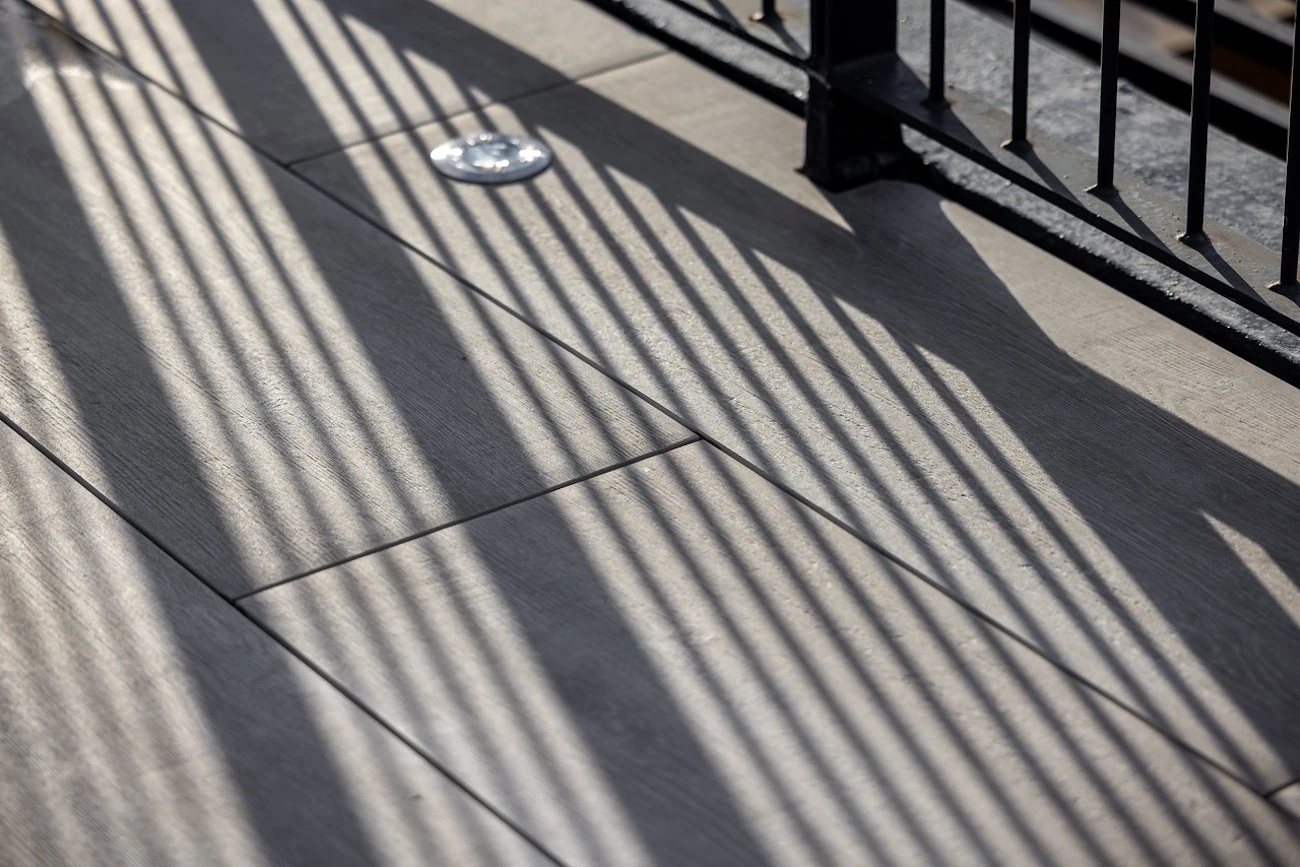 The installation was carried out well and according to expectations. The client and the residents of the Plimsoll Building were extremely pleased with the results as the woodgrain effect of the Atria porcelain tiles preserved the natural, organic warmth of timber decking while providing a fire-safe, non-slip, maintenance free surface. Measures to prevent wind uplift and allow easy access to areas below the decking also improved the practicality of the decking from the perspective of facilities management.