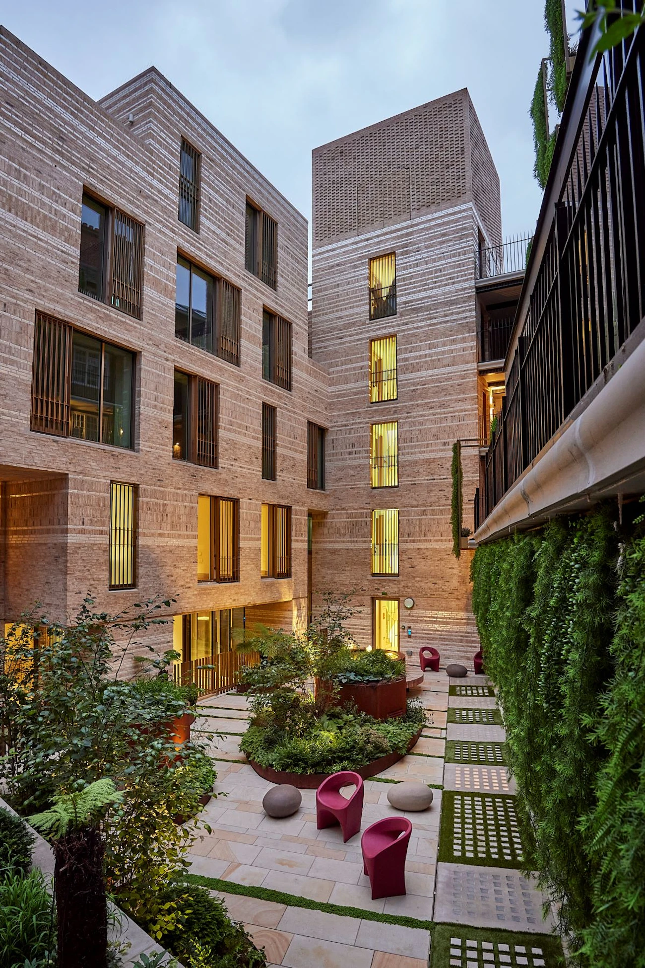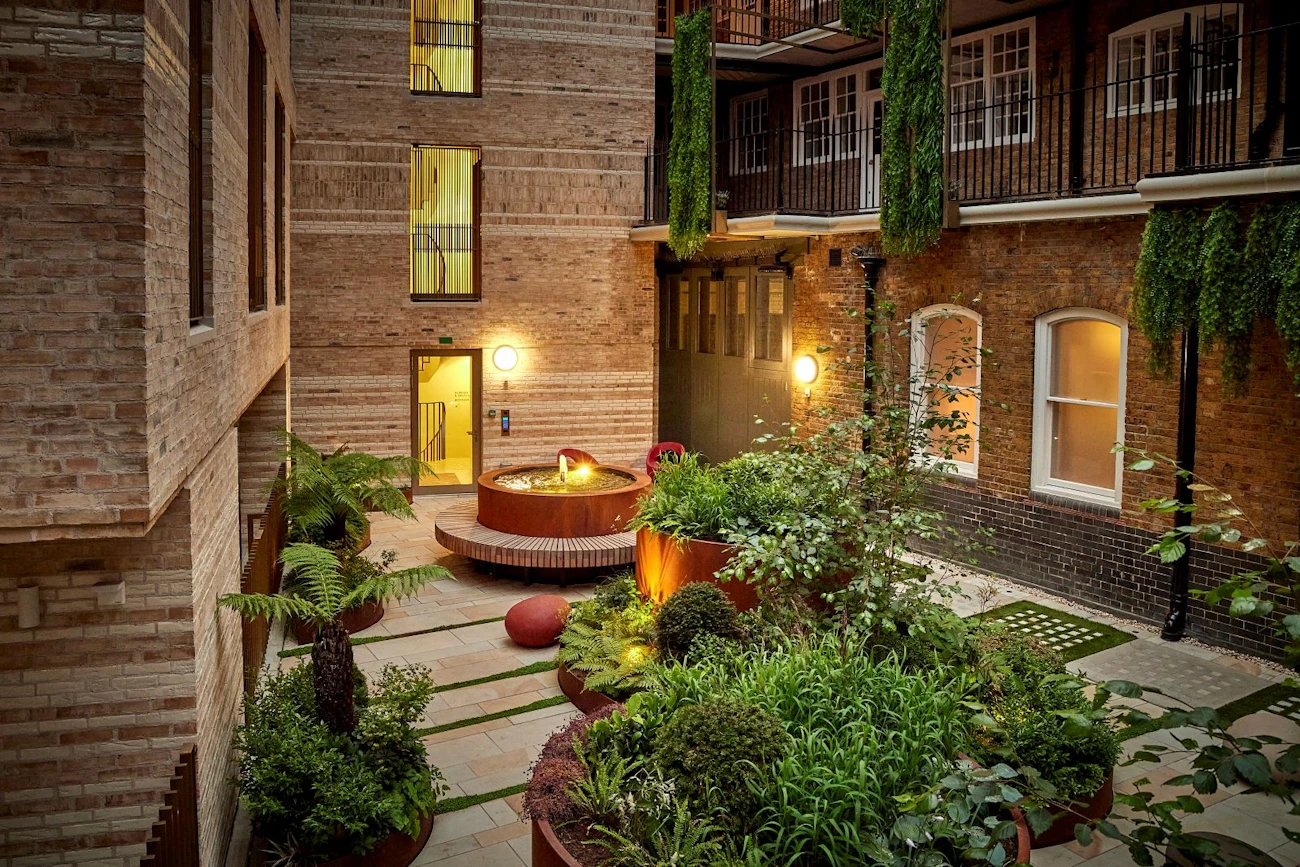 Four years later, plans were drawn up to convert the iconic building into a ground-floor restaurant and 6 luxury apartments above, with a single-storey basement excavated underneath the entire site. A new, secondary building on the site would contain a further 11 apartments.An inner courtyard was to be landscaped with natural stone paving to complement the tones of the original brickwork and sculpted CorTen steel planters to soften the harsh geometry of the building. Timber benches were to be integrated into the planters and surround a raised pool and fountain walled by matching CorTen steel, to provide areas for relaxation and socialising.The ChallengesAs the landscaping was all to be supported by a concrete foundation over the basement, the weight and loading of the planters was a particular challenge. The expertise of the Raaft technical team was crucial in ensuring that even with damp soil, the planters would remain safely within the maximum loading capacity of the concrete.The InstallationThe landscape architect selected ground level Planterline Curved Planter System and Ambit Integrated Seating, both from Raaft, for the design. The planters were given organic shapes and differing heights to add interest and structure.All of the bench seating was constructed in natural timber CorTen weathering steel was used throughout for the pool surround and planters to complement the tones of the brickwork and provide a perfect counterpoint to the verdant foliage.Products UsedGround Level Planters: Planterline CurvedSeating: Ambit Integrated SeatingThe ResultThe ground level courtyard is a haven of tranquillity, both for those who relax among the planters or sit around the fountain pool and for residents whose windows and balconies overlook it. The organic shapes of the planters and seating draw the eye onward through the design, creating a pleasant contrast to the straight lines of the surrounding buildings.The project earned praise for its innovative design and tranquil atmosphere, winning the prestigious BALI Principal Award in 2023 for Hard Landscaping Construction (non-domestic). This award highlights the project's excellence and outstanding contribution to the field.