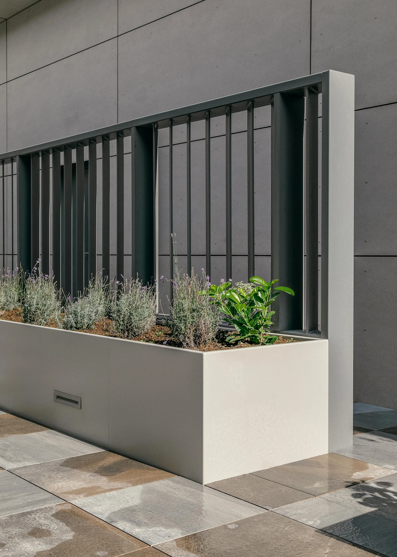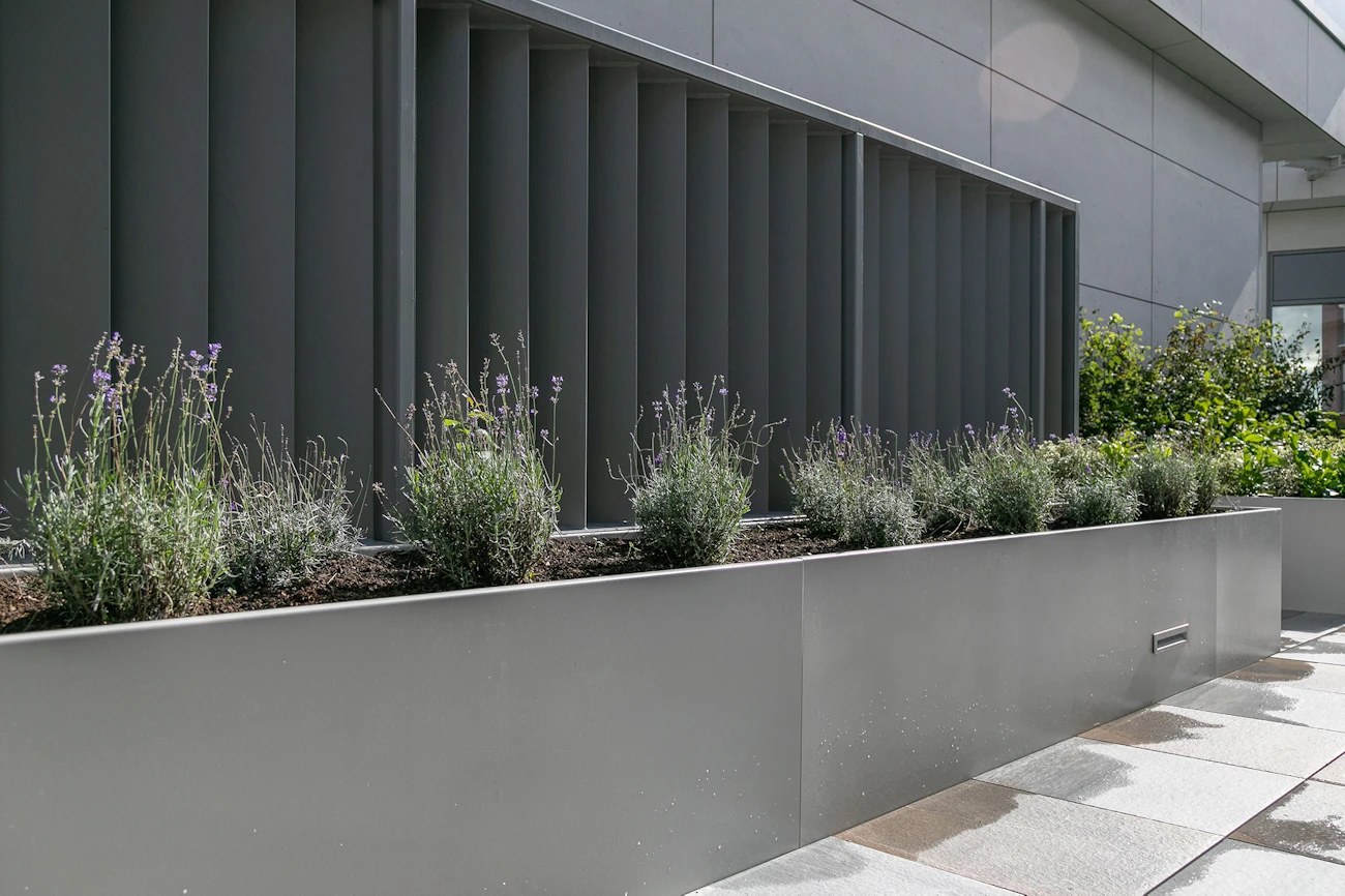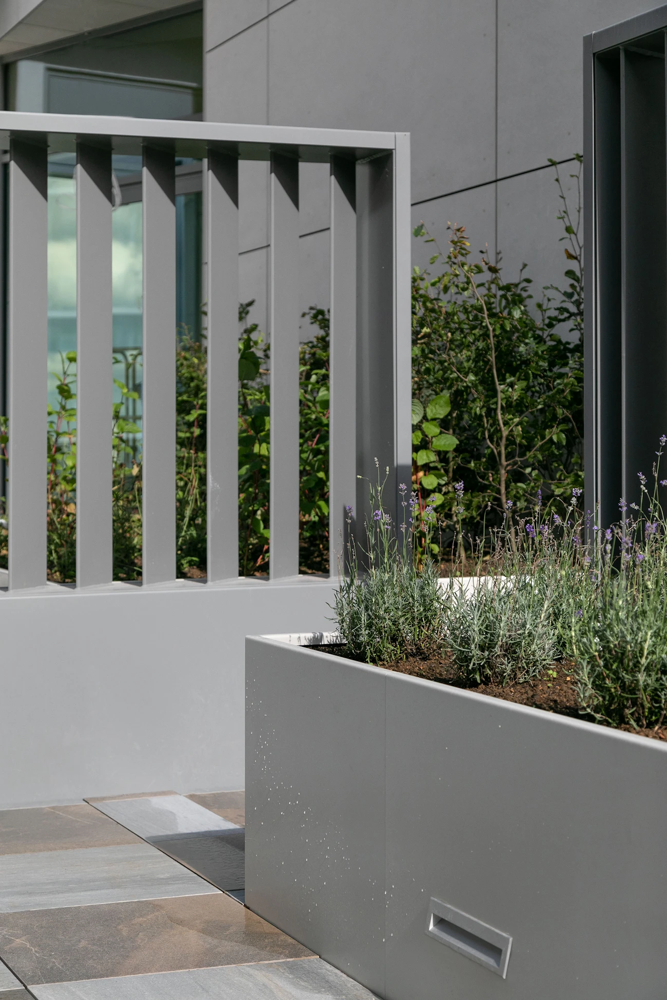 To complement the natural colour palette of the entire project, Straight Planter Walls were powder-coated to RAL 7044 (Silk Grey), a durable, low-maintenance surface that also complies with Class A fire regulations. To create additional visual interest, the architects also harmonised three colours from the Atria Roma range of porcelain tiles - Atria Roma Copper, Atria Roma Lead and Atria Roma Natural – for the walkways and seating areas. Porcelain is an extremely durable, low-maintenance, Class A fire-rated product that is rot-proof, mould and moss-resistant and safe even when wet.