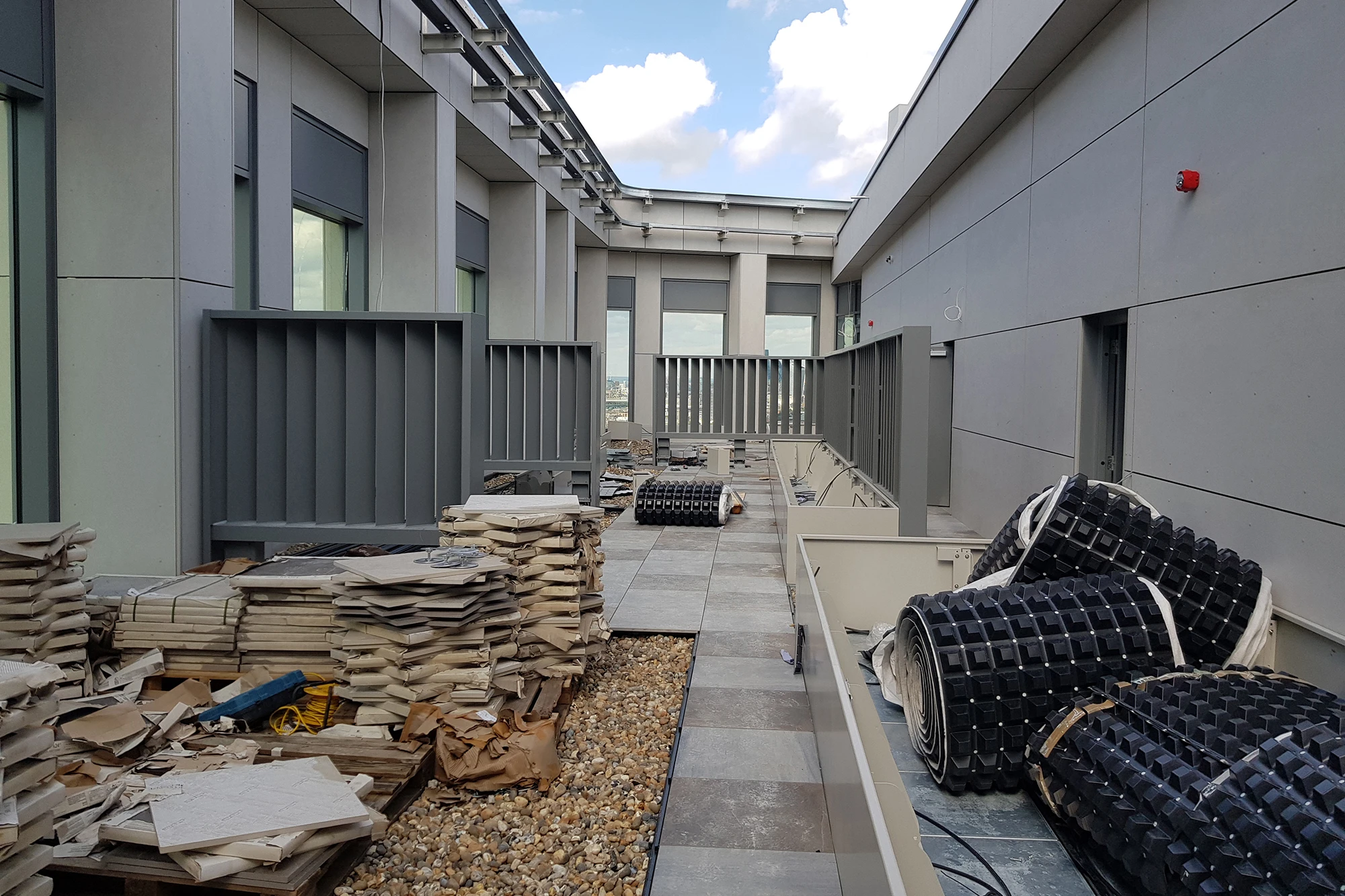 Landscape architects Optimised Environments therefore sought to mirror this effect in the terrace system and planted areas used for the roof space, which would need to also be Class A fire-rated for use on high-rise developments. Sourcing all hard landscaping materials from Raaft became an obvious decision. Fire-safe Rooftop TerraceDesigning the terrace from the ground up, they formed a platform using Raaft’s modular system of 50mm Aluminium Joists supported on Fire-rated Adjustable Pedestals to create a level, loadbearing base for the heavy planters, and Floor Structure Panels were placed at planter locations to provide a stable, permeable base for planting.